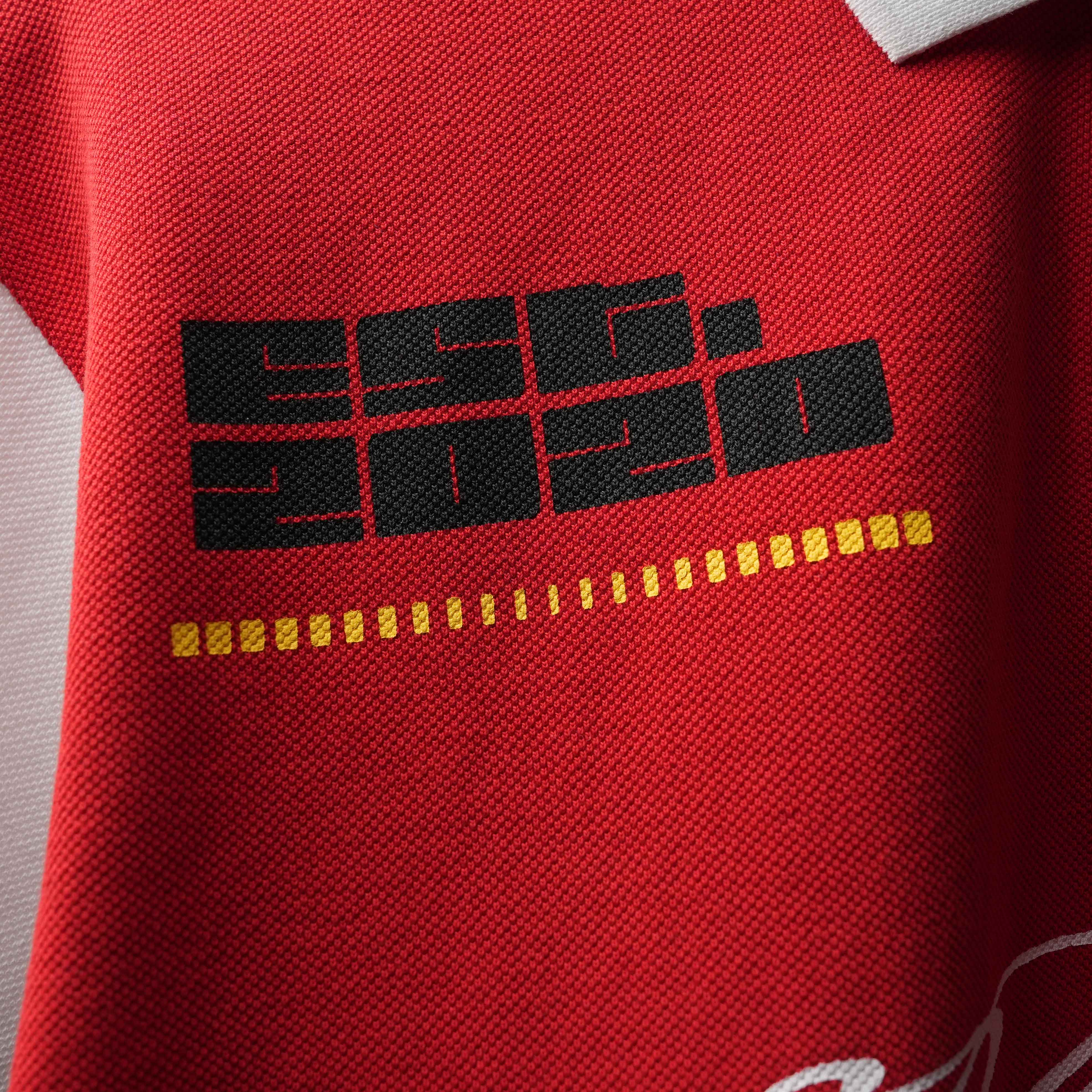 Racing-inspired zipper polo T-shirt with tones of red, white and black. With a screen print on the front and back, the polo T-shirt has been created with cut and sew panels.