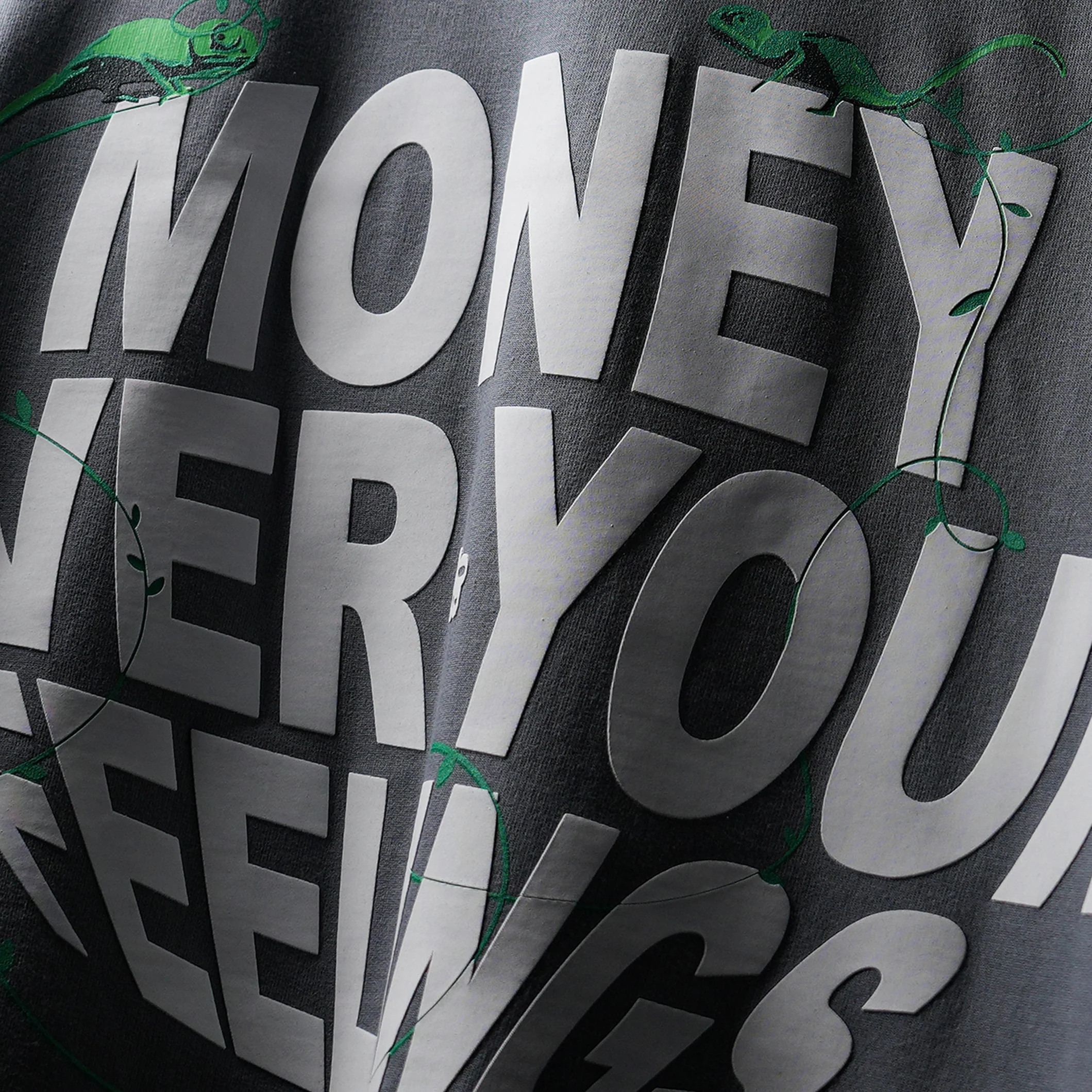 Grey Materialistic T-shirt in cotton with bold Money Over Your Feelings print. BLUORNG's signature oversized fit for a stylish, relaxed streetwear look.